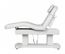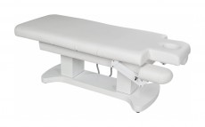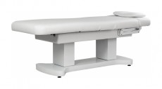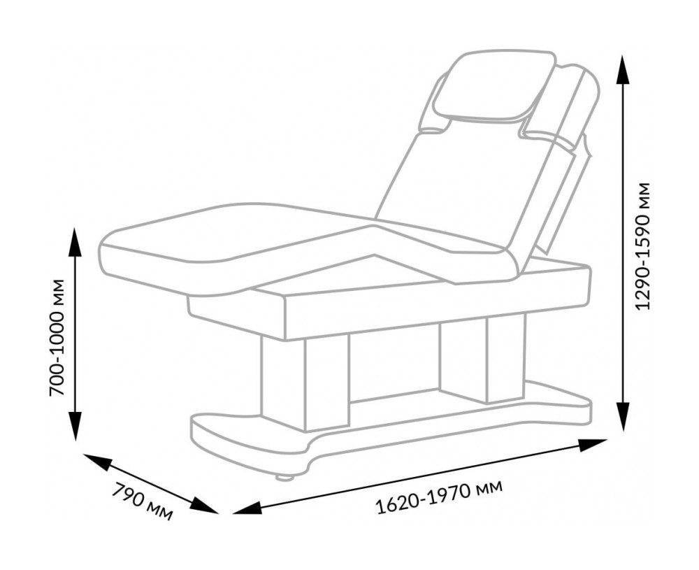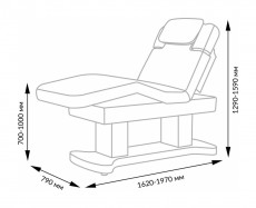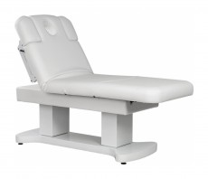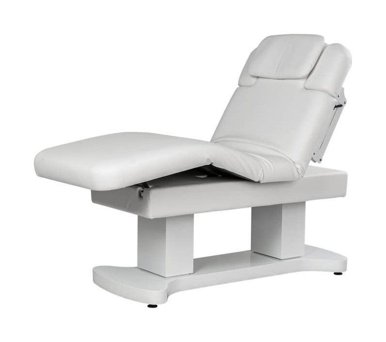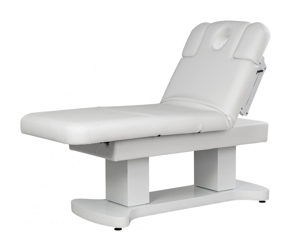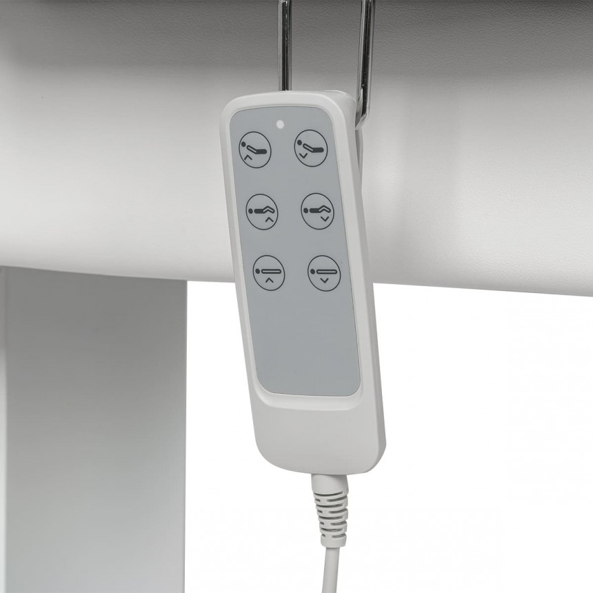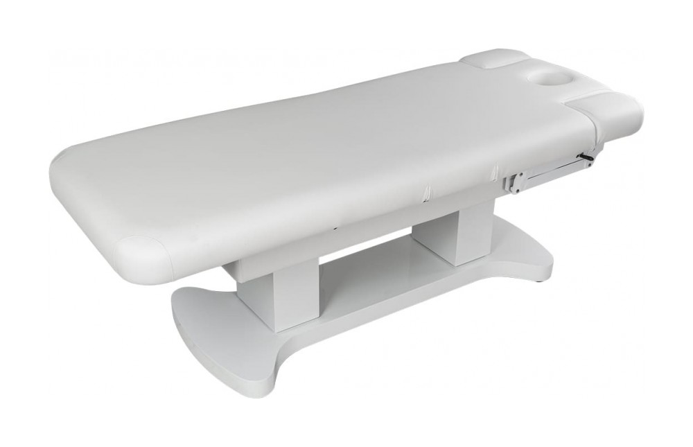 Её надёжность обеспечивают две устойчивые колонны металлического каркаса с влагозащитным антикоррозийным покрытием, а основание выполнено из ЛДСП. Высоту кушетки регулируют два синхронизированных электромотора, что гарантирует стабильность и долговечность конструкции.
