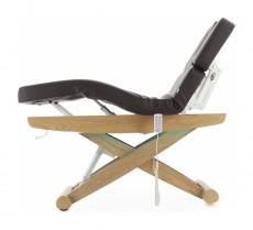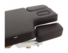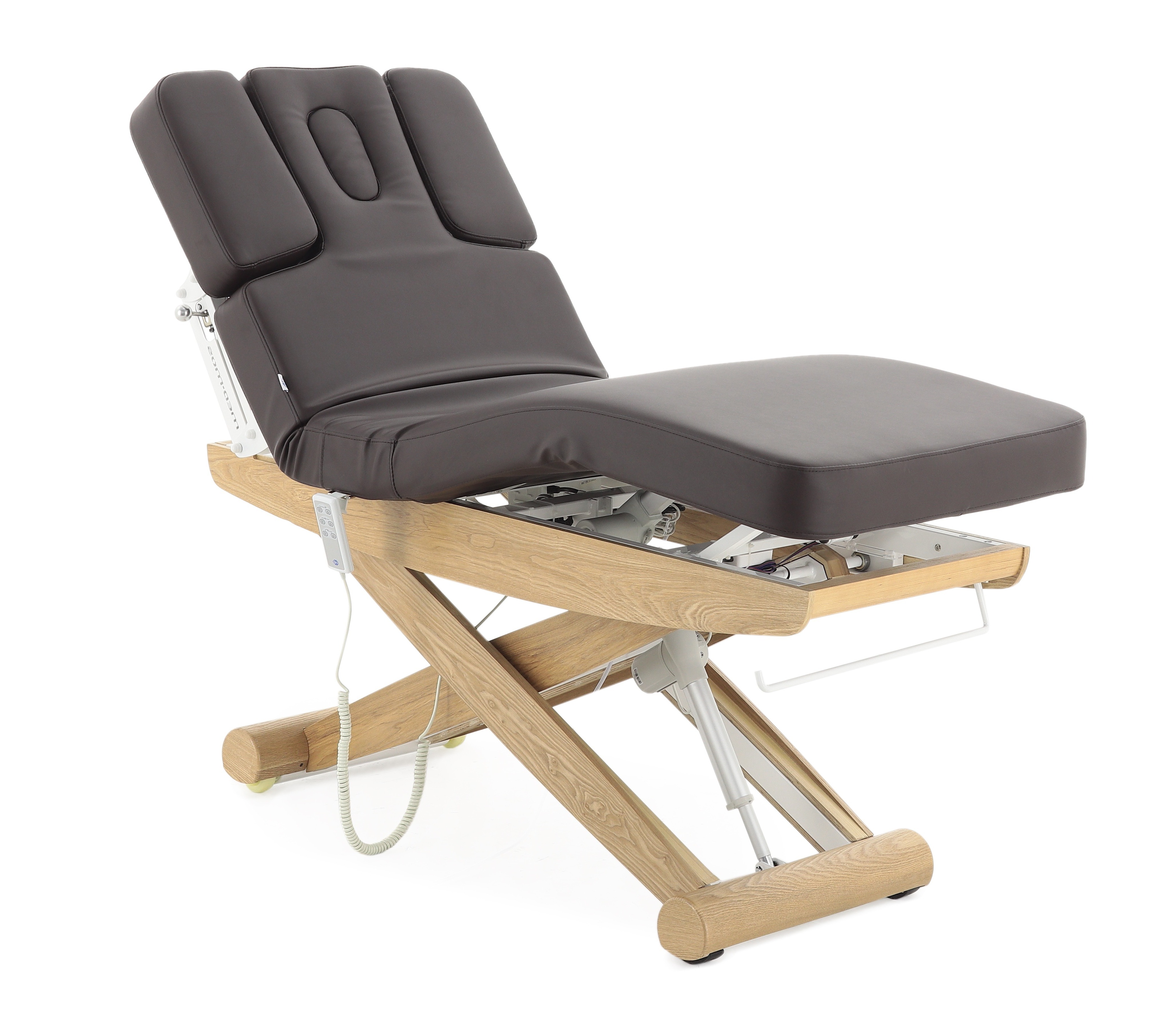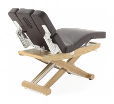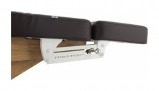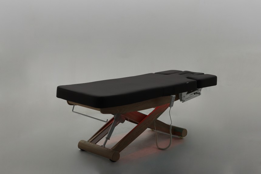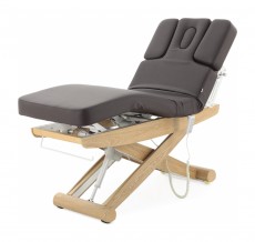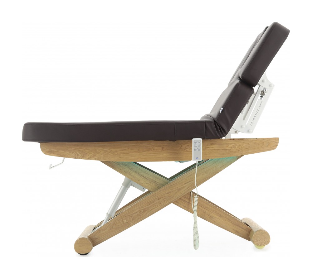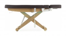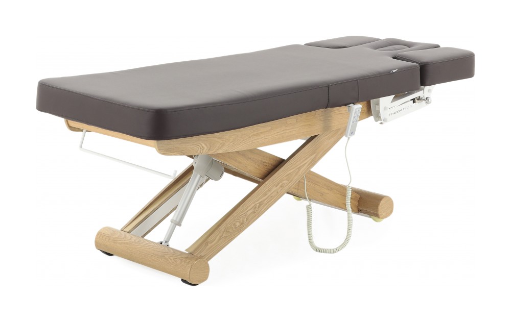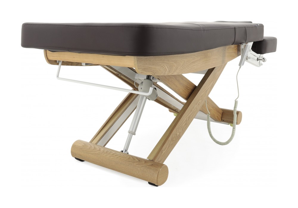 Все секции стола регулируются с помощью электроприводов. Устойчивая рама из прочной стали выдержит нагрузку намного больше среднестатистической. Этот массажный стол с обладает еще одним преимуществом. Его рабочая поверхность выполнена из упругого поролона (способным удерживать первоначальную форму даже при длительном использовании). В свою очередь, он покрыт качественной полиуретановая (ПУ) кожей, легкой в уходе и долговечной в эксплуатации. Особенностью данного стола является имитация рамы под дерево.