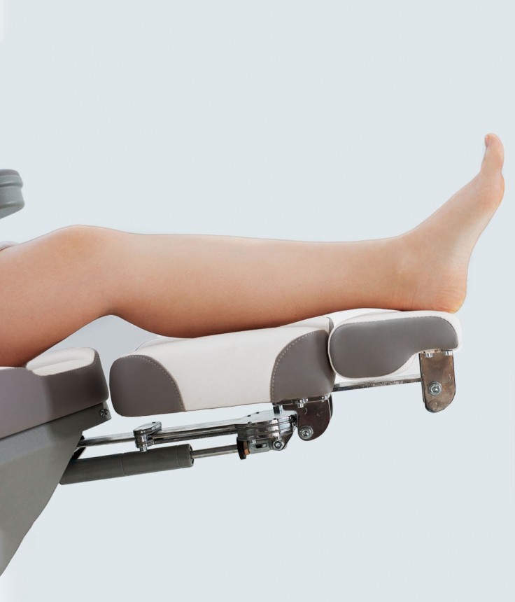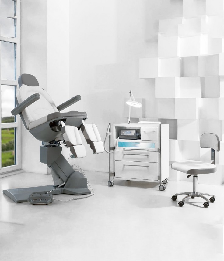 Педикюрное кресло оснащено тремя электромоторами, обеспечивающими регулировку высоты, угла наклона спинки и угла наклона сиденья. Опоры для ног фиксируются при помощи газ-лифтов. Кресло легко раскладывается в горизонтальное положение, образуя ровную поверхность. Надежная конструкция системы подъема обеспечивает высокую устойчивость кресла даже при максимальной высоте. Откидывающиеся подлокотники делают более удобным процесс посадки клиента. Управляется при помощи ручного проводного пульта.