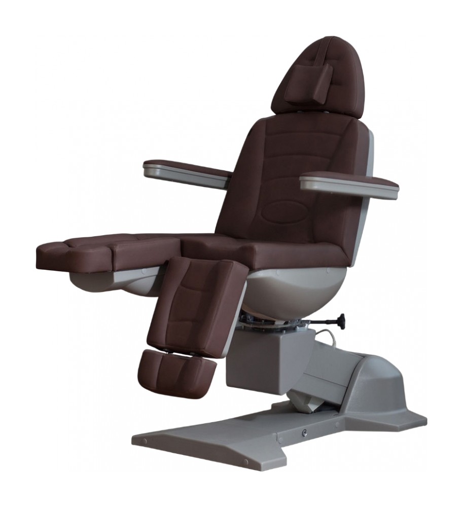 Педикюрное кресло оснащено тремя электромоторами, обеспечивающими регулировку высоты, угла наклона спинки и угла наклона сиденья. Опоры для ног фиксируются при помощи газ-лифтов. Кресло легко раскладывается в горизонтальное положение, образуя ровную поверхность. Надежная конструкция системы подъема обеспечивает высокую устойчивость кресла даже при максимальной высоте. Откидывающиеся подлокотники делают более удобным процесс посадки клиента. Управляется при помощи ручного проводного пульта. Дополнительно при производстве могут быть установлены различные опции.